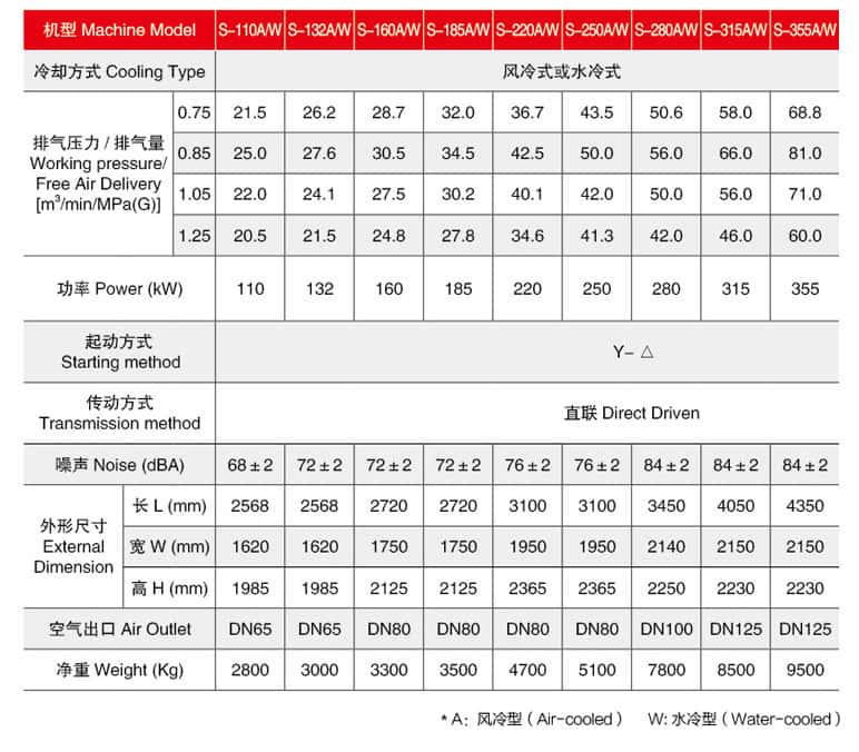 薩震5.5~90KW微油螺桿空壓機(jī)型號(hào)參數(shù):